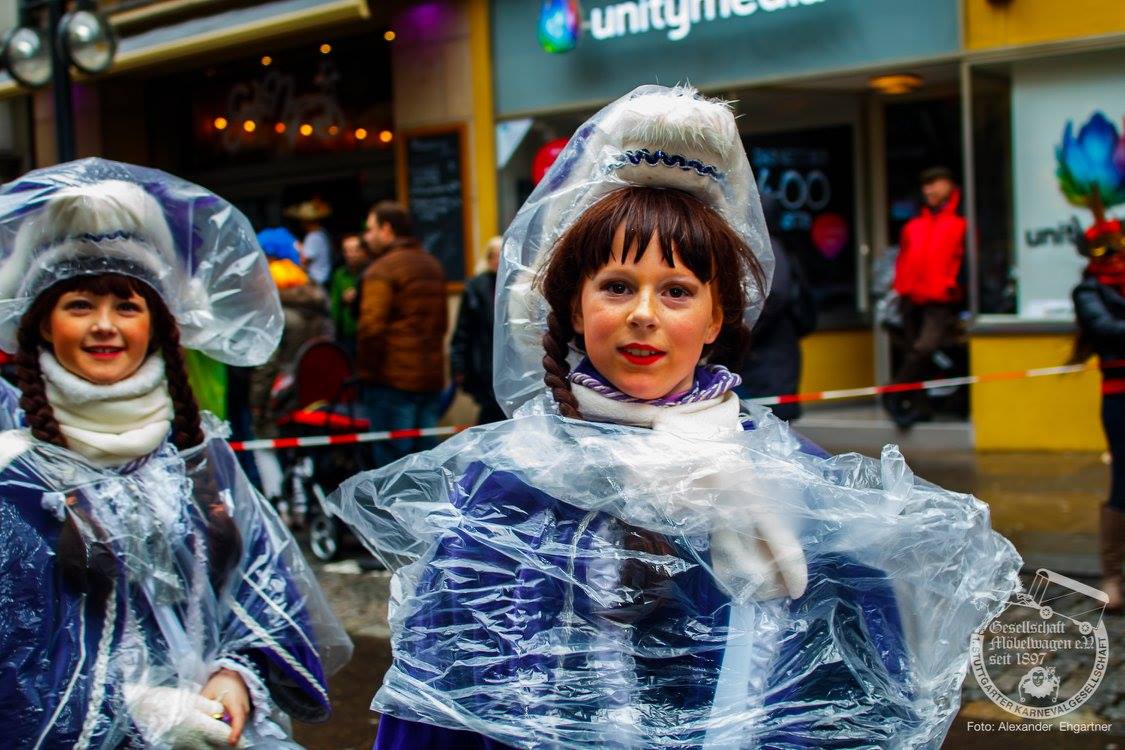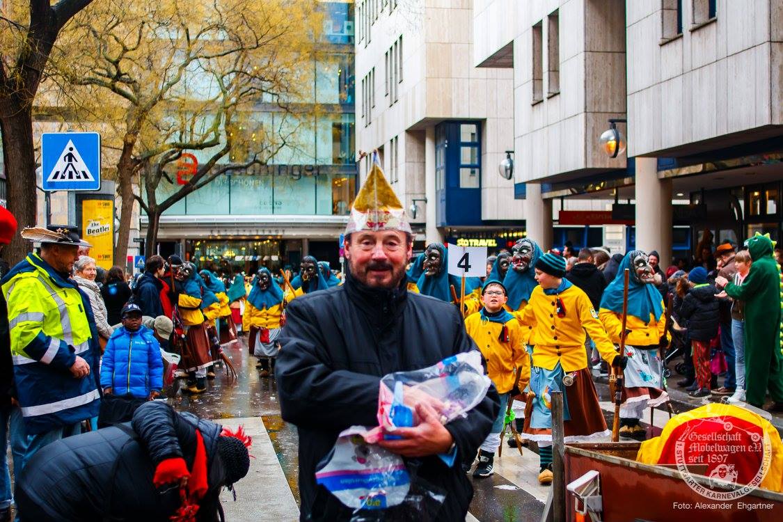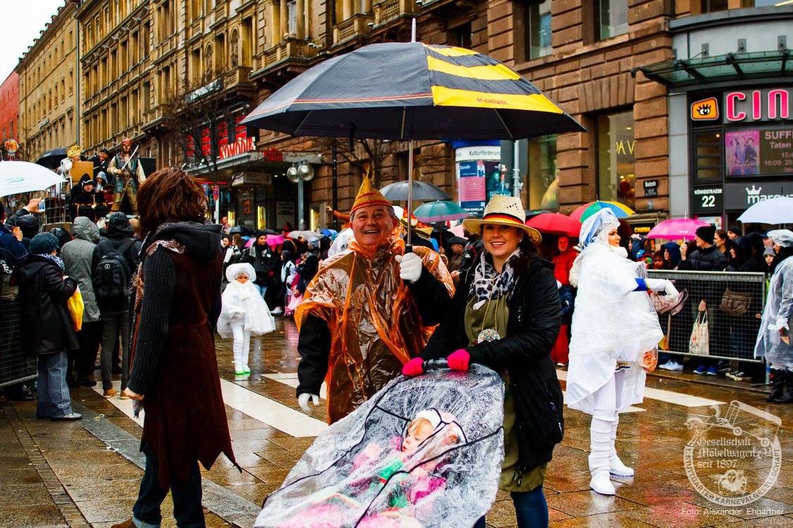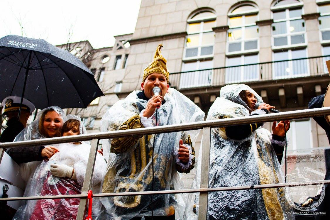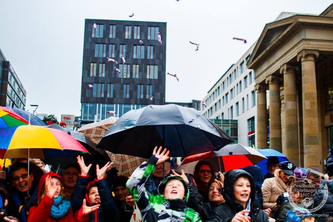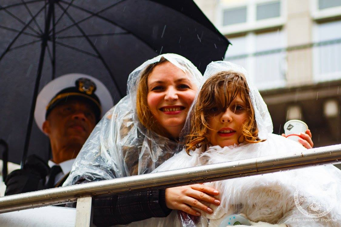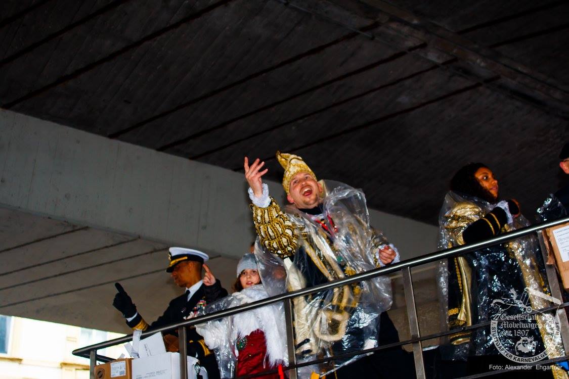 Pünktlich zu Umzugsbeginn goß es wie aus Eimern. Doch wir alle wissen, es gibt kein schlechtes Wetter, sondern nur schlechte Kleidung! Und wir Möbler hatten natürlich vorgesorgt! Alle wurden in Plastikhüllen verpackt und los ging es. Schon nach wenigen Metern säumten Unmengen an feierlustigen Narren den Straßenrand. Da kam unser Prinzenpaar an Deck der Black Pearl natürlich gerade recht. SIe unterhielten die Narren am Straßenrand während des gesamten Umzugs mit Livemusik und brachten die Mengen zum toben.