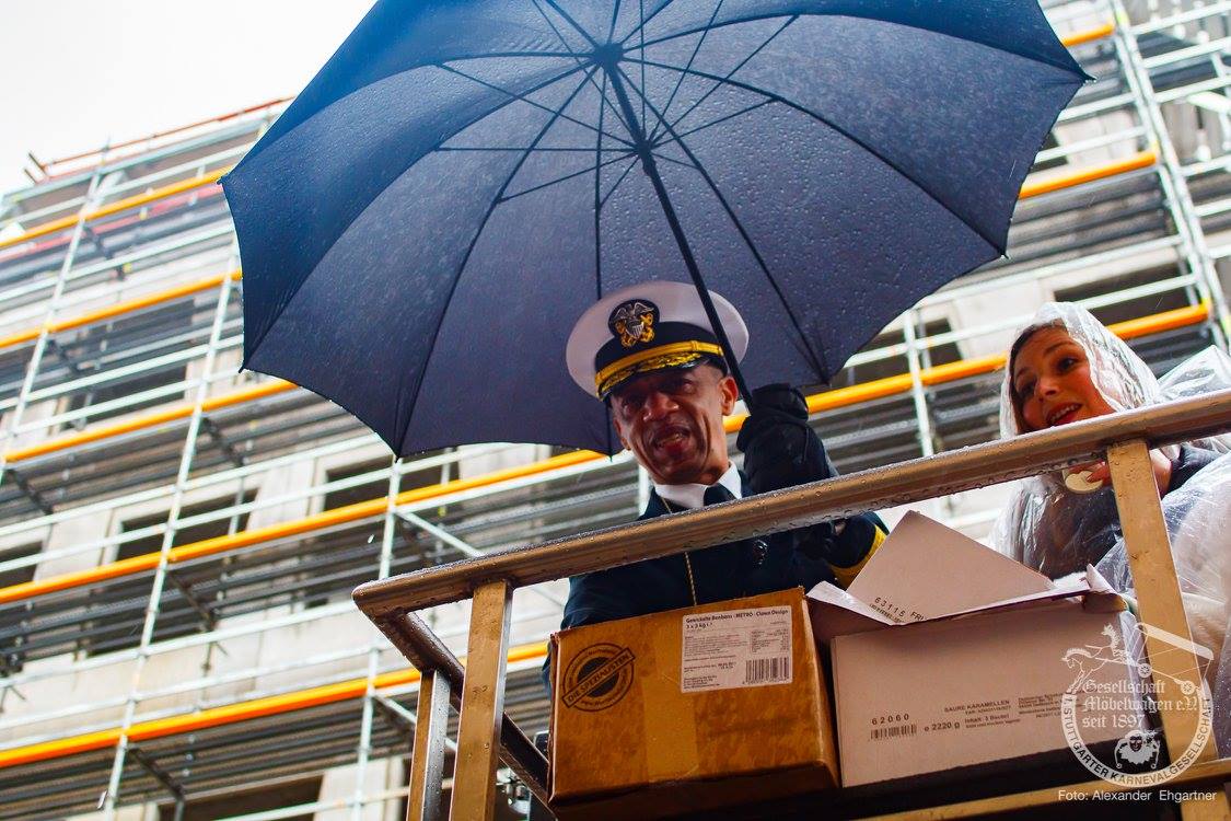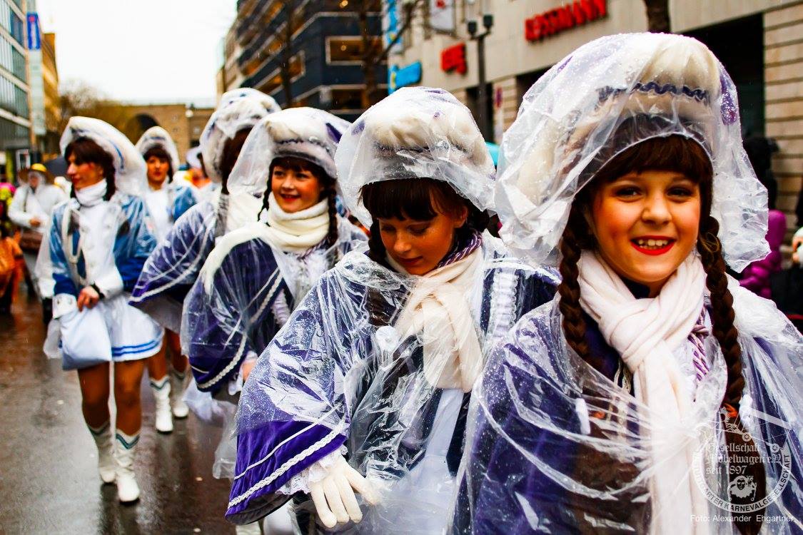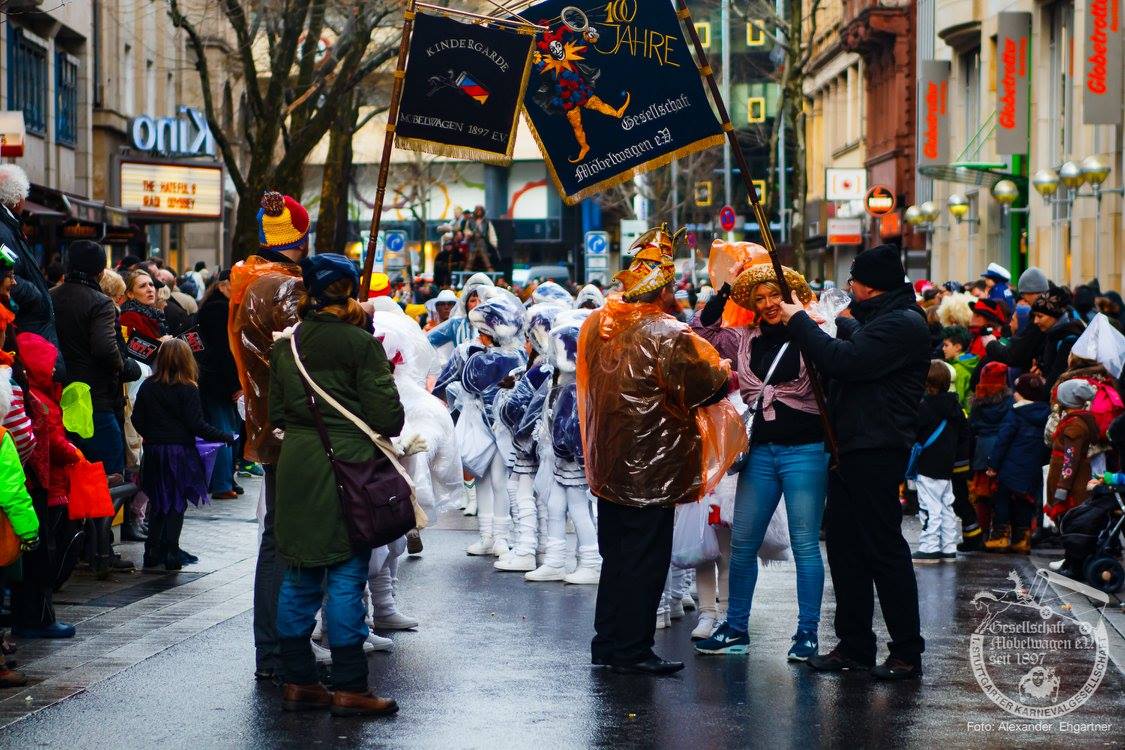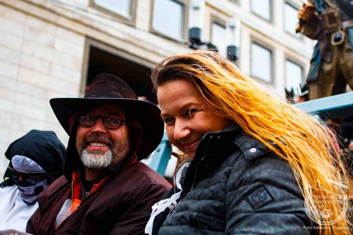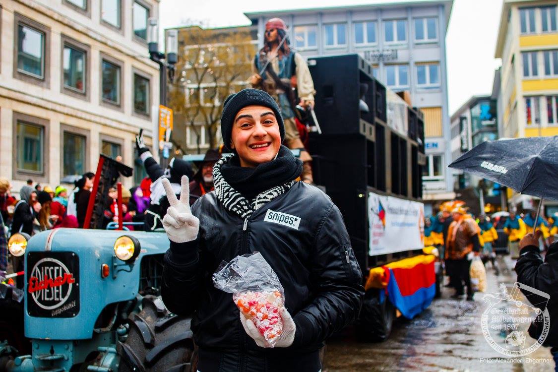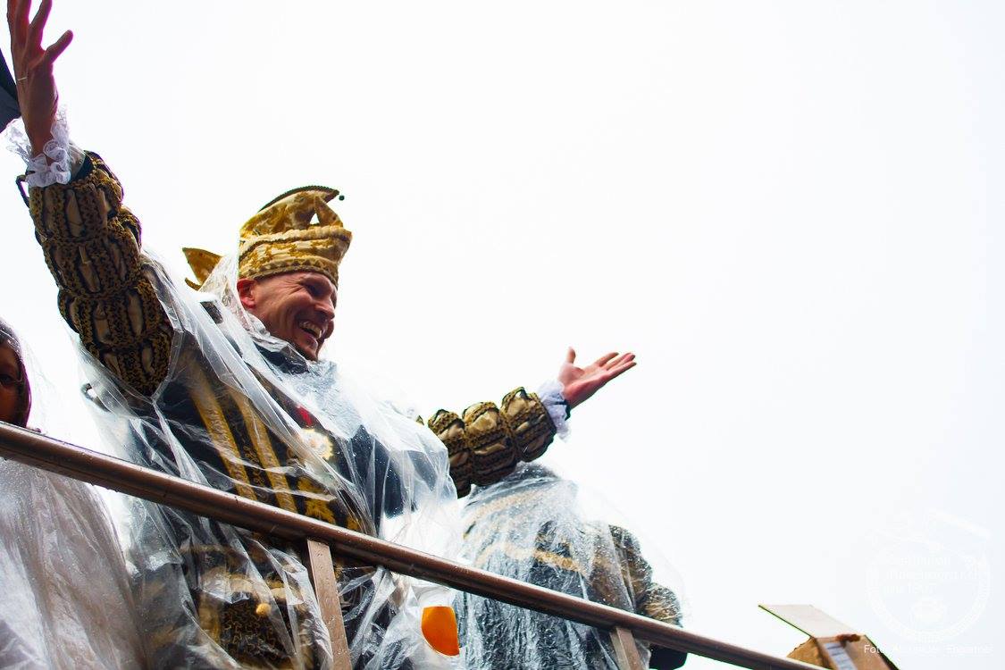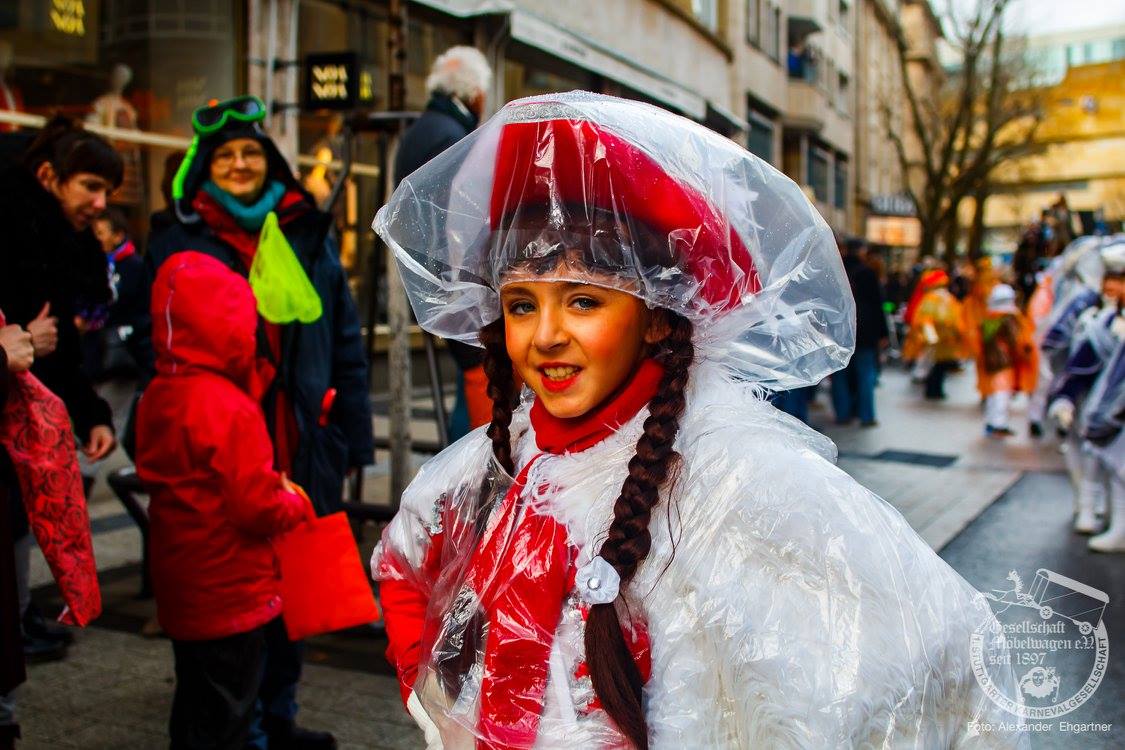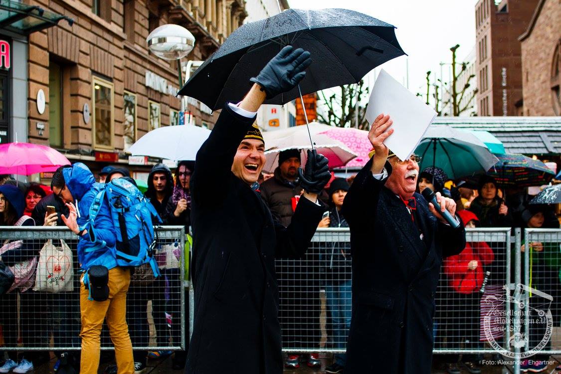 Pünktlich zu Umzugsbeginn goß es wie aus Eimern. Doch wir alle wissen, es gibt kein schlechtes Wetter, sondern nur schlechte Kleidung! Und wir Möbler hatten natürlich vorgesorgt! Alle wurden in Plastikhüllen verpackt und los ging es. Schon nach wenigen Metern säumten Unmengen an feierlustigen Narren den Straßenrand. Da kam unser Prinzenpaar an Deck der Black Pearl natürlich gerade recht. SIe unterhielten die Narren am Straßenrand während des gesamten Umzugs mit Livemusik und brachten die Mengen zum toben.